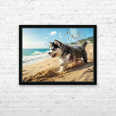 Siberian Husky Puppy Discovers Sandy Beach Fun Picture Frame Printing