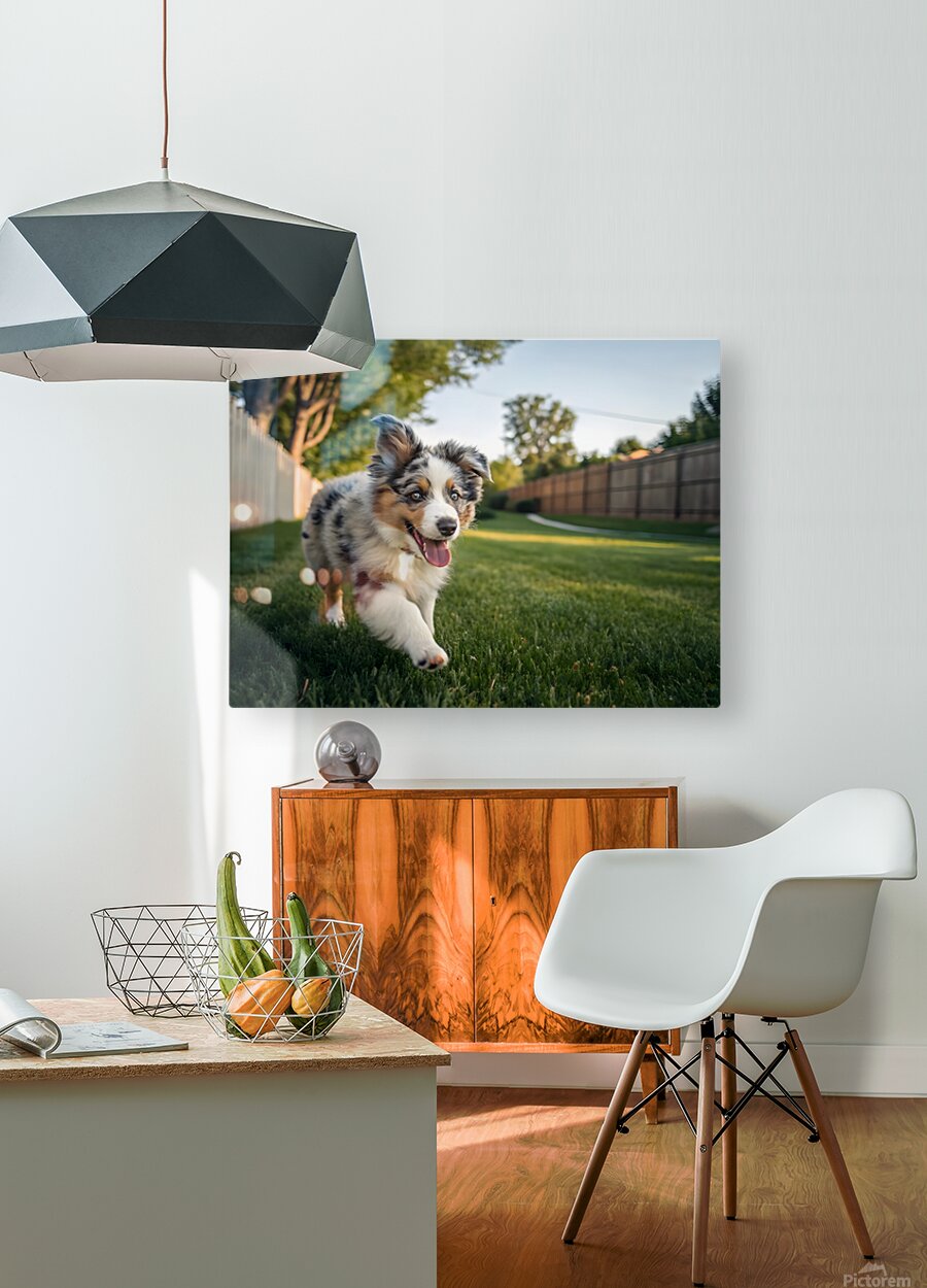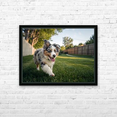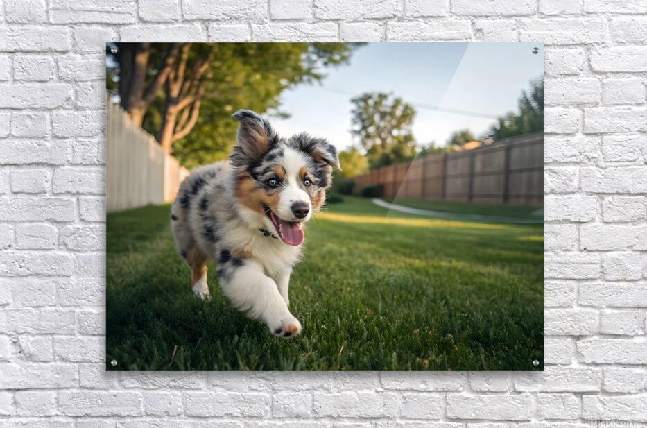 Get this artwork "Australian Shepherd Puppy Gets The Zoomies In Backyard" in a framed print.