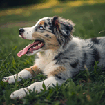 An exhausted blue merle Australian Shepherd puppy sprawls on green grass, panting with tongue out, amber eyes bright but tired, fluffy tri-colored coa...[+]