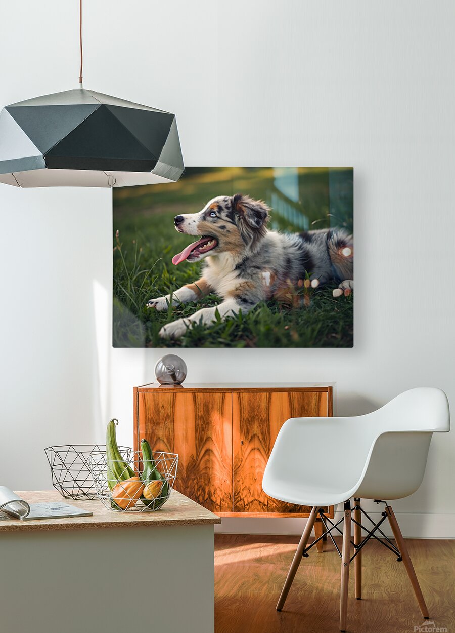 ABOUT THIS ARTWORK: TIRED AUSTRALIAN SHEPHERD PUPPY RESTS AFTER ZOOMIES