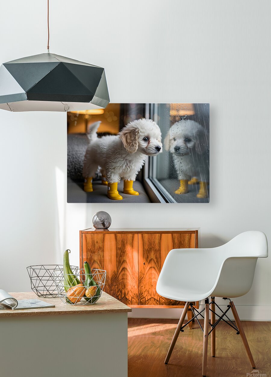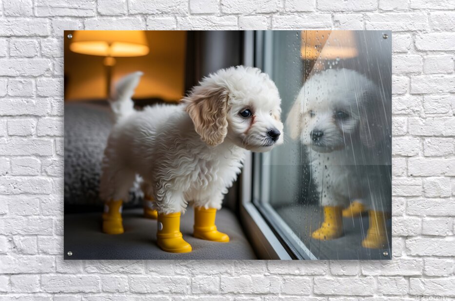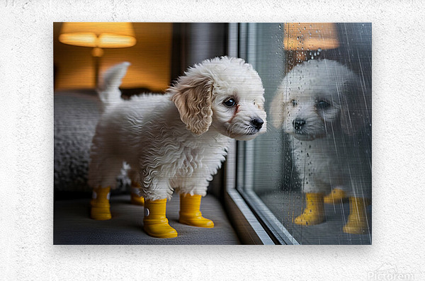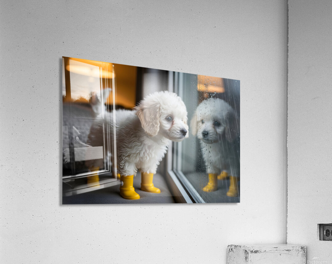 A fluffy white poodle puppy with adorable yellow rain boots gazes eagerly through a window at the pouring rain outside. The puppy's curly coat is pristine white and its tail wags with anticipation for outdoor fun. Digital Artwork.