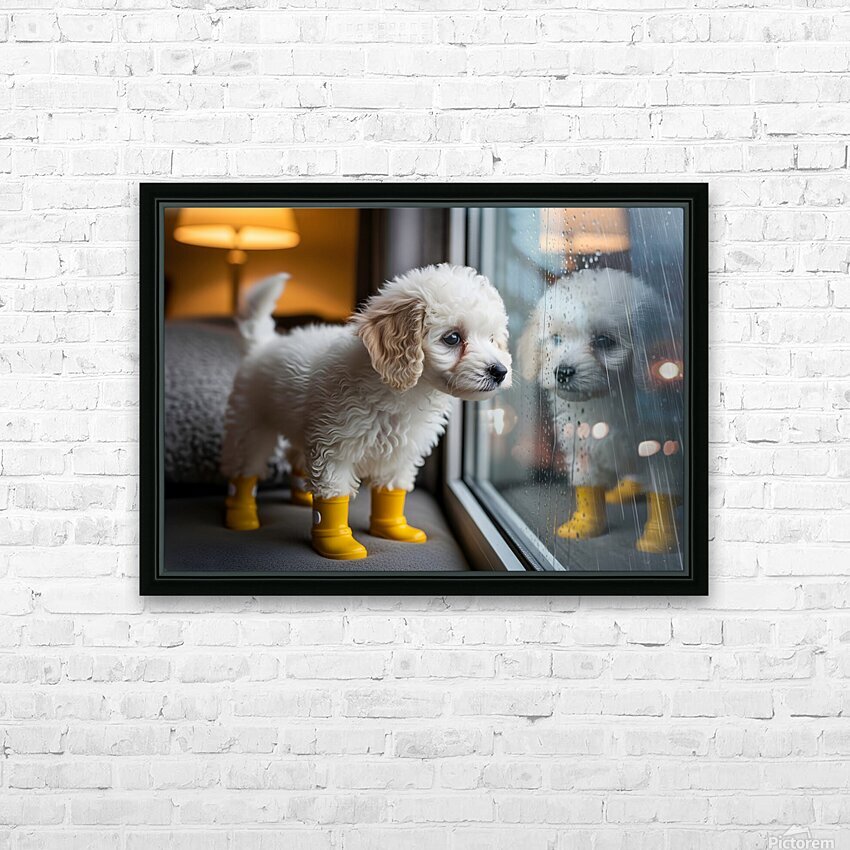 A fluffy white poodle puppy with adorable yellow rain boots gazes eagerly through a window at the pouring rain outside. The puppy's curly coat is ...[+]