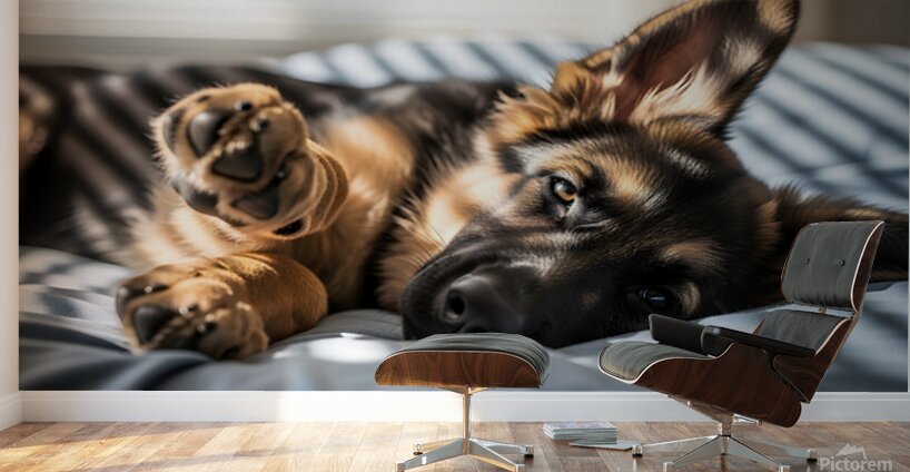 The German Shepherd puppy starts to wake from its nap stretching one small paw while remaining cozy in the blue bed. Its eyes begin to flutter open with that adorable sleepy puppy expression. Digital Artwork.