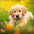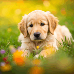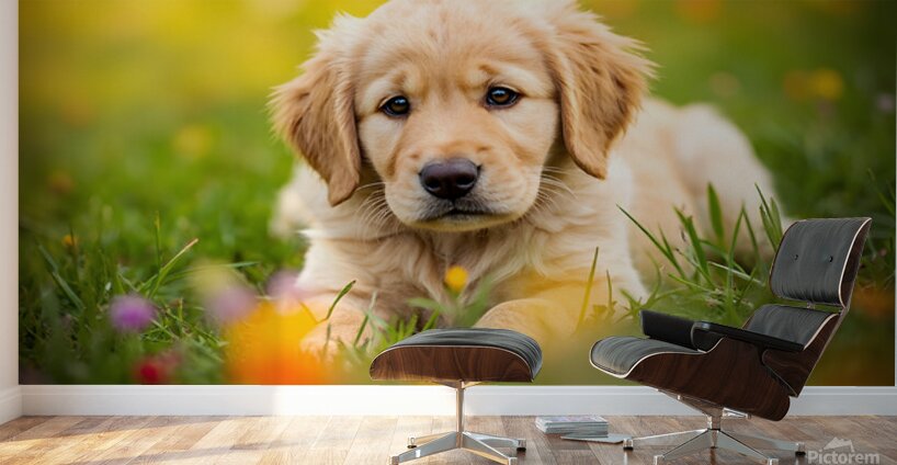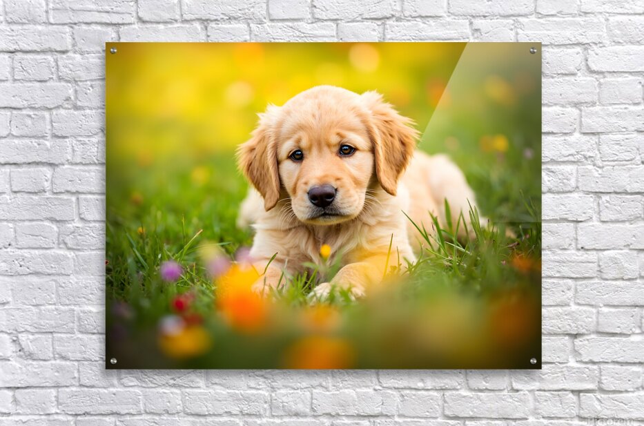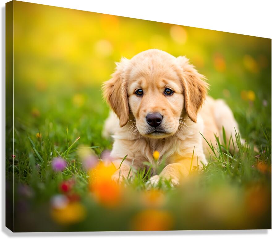 A fluffy golden retriever puppy lies flat on green grass with legs spread wide in a sploot position. The young dog has a curious expression with bright eyes and golden fur catching sunlight. Blurred flowers create a soft foreground. Digital Artwork.