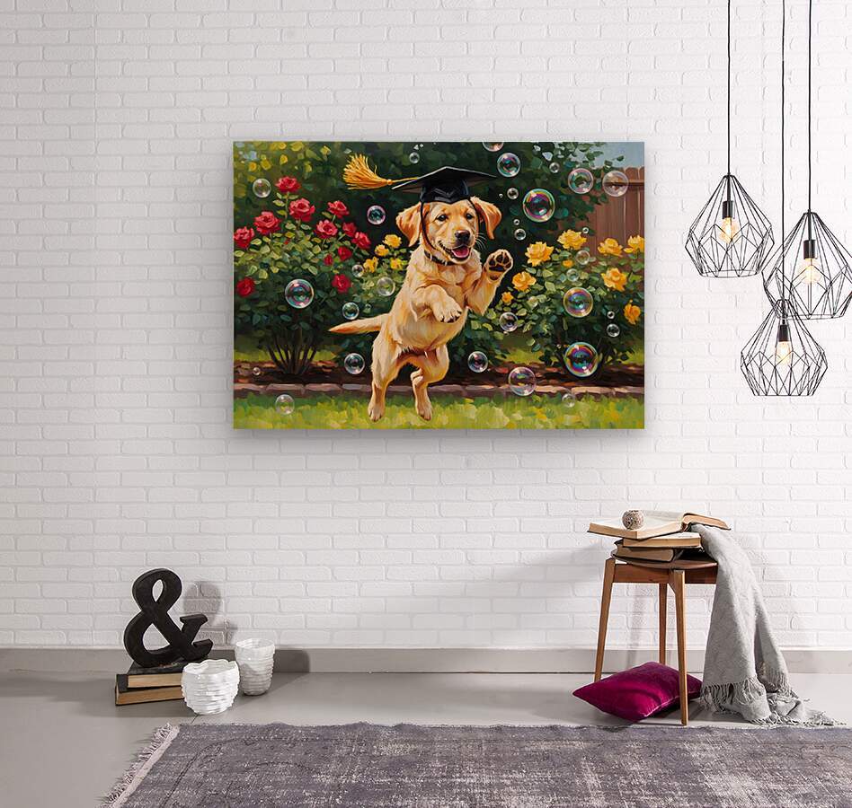 A golden Labrador puppy wearing a black graduation cap leaps joyfully into the air with front paws raised high. Soap bubbles float around the excited graduate in a beautiful garden setting surrounded by blooming rose bushes. Digital Artwork.