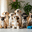 A adorable golden and white Shih Tzu puppy sits with other excited puppies all gazing upward at treats. The fluffy puppys eyes are bright with anticip...[+]