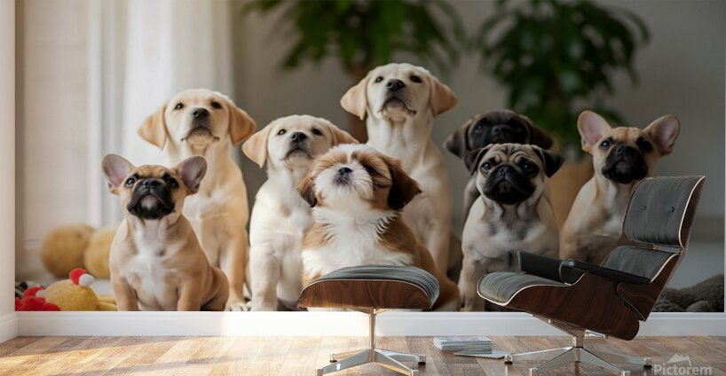 A adorable golden and white Shih Tzu puppy sits with other excited puppies all gazing upward at treats. The fluffy puppys eyes are bright with anticipation as the group eagerly waits for snack time in a cozy indoor setting. Digital Artwork.