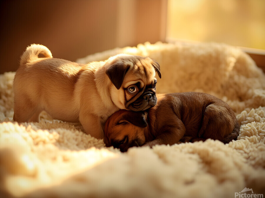 A sweet fawn pug puppy with black face markings stands in warm sunlight gently nudging a sleeping brown companion with its tiny nose. The caring pugs tail shows a slight wag as it tries to wake its friend from their peaceful slumber on the cozy blanket. Digital Artwork.