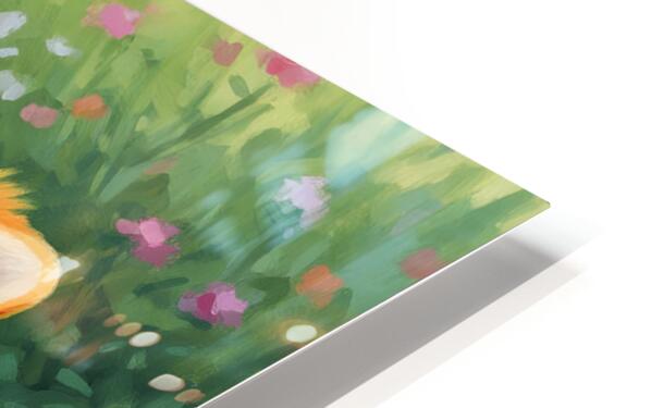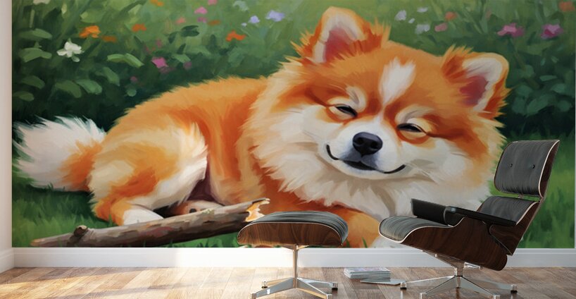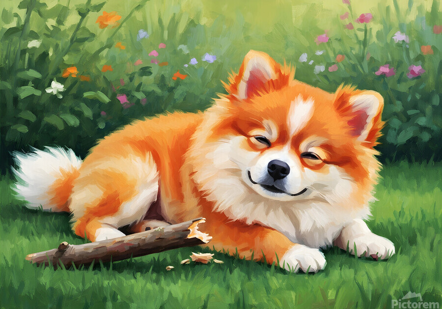The tired but happy orange and white Pomeranian puppy rests peacefully on the grass beside its thoroughly chewed wooden stick. The little pups expression shows complete satisfaction after an enjoyable play session in the garden. Digital Artwork.
