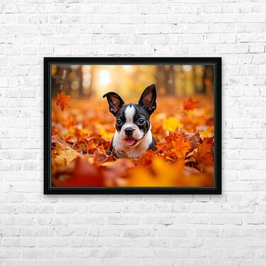 Boston Terrier Puppy Discovers Autumn Leaf Pile Frame print