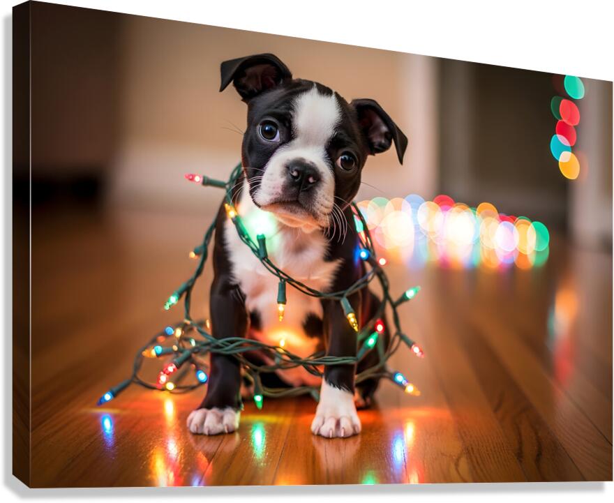 Boston Terrier Puppy Discovers Sparkling Christmas Lights Canvas print