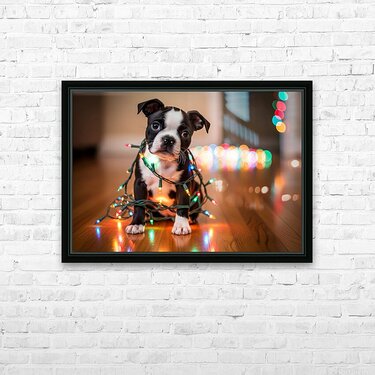Boston Terrier Puppy Discovers Sparkling Christmas Lights Picture Frame Printing