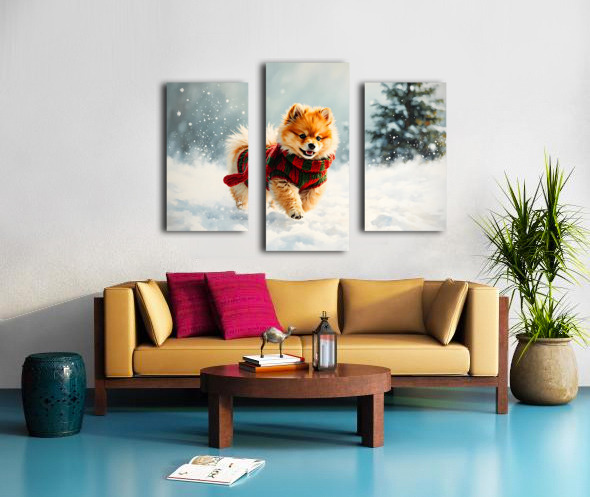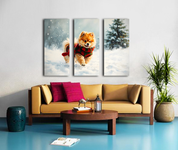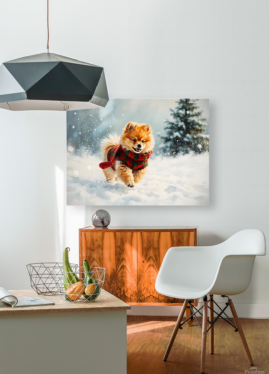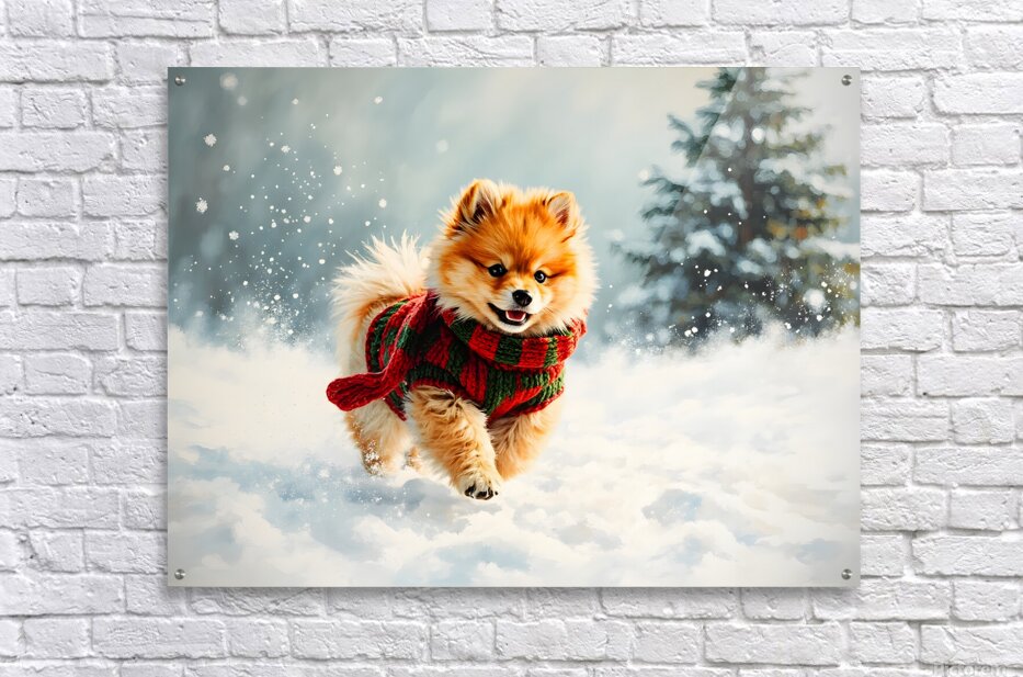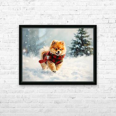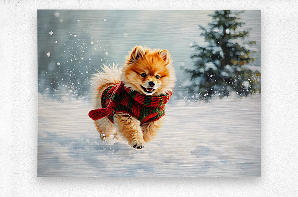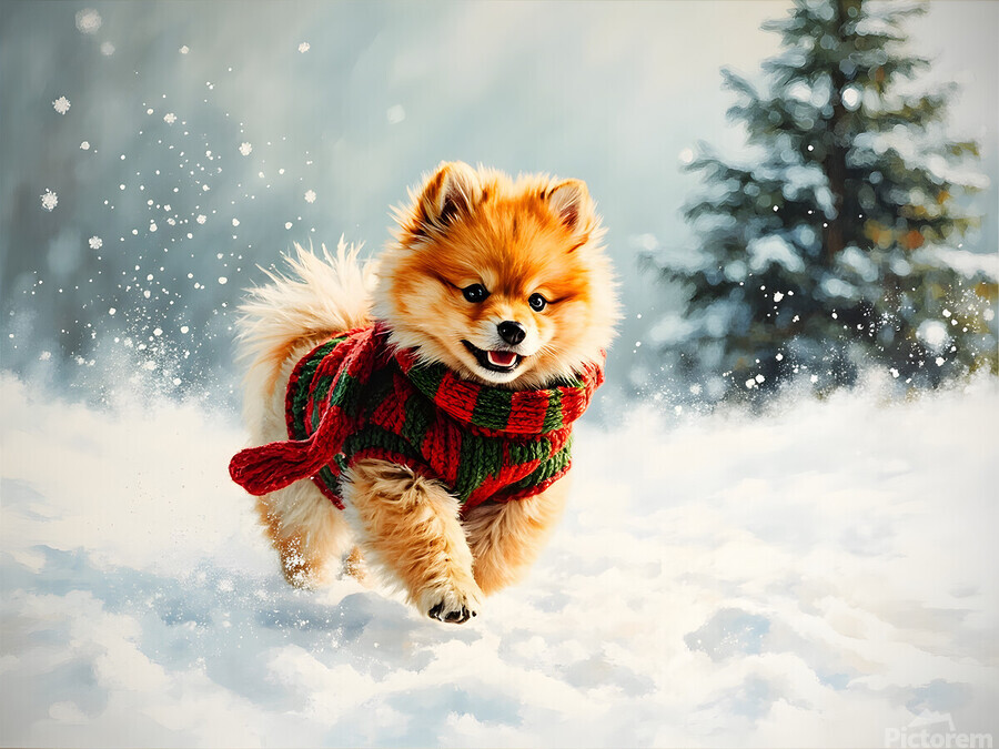 ABOUT THIS ARTWORK: POMERANIAN PUPPY IN HOLIDAY SWEATER PLAYING IN SNOW