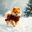 An energetic golden Pomeranian puppy bundled up in a cozy striped holiday sweater and scarf frolicking joyfully in pristine white snow with evergreen trees softly blurred behind Digital Artwork.
