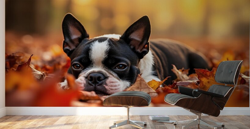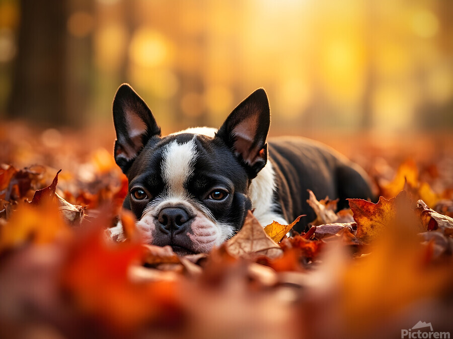 A peaceful black and white Boston Terrier puppy lies contentedly among autumn leaves after playtime. The tired pup rests on a bed of colorful fall foliage with droopy eyes showing the satisfying exhaustion that comes after energetic play. Digital Artwork.