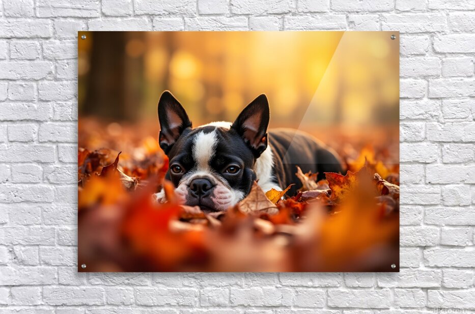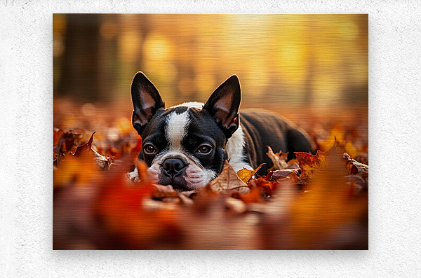 Get this artwork "Sleepy Boston Terrier Puppy Rests In Autumn Leaves" in a framed print.