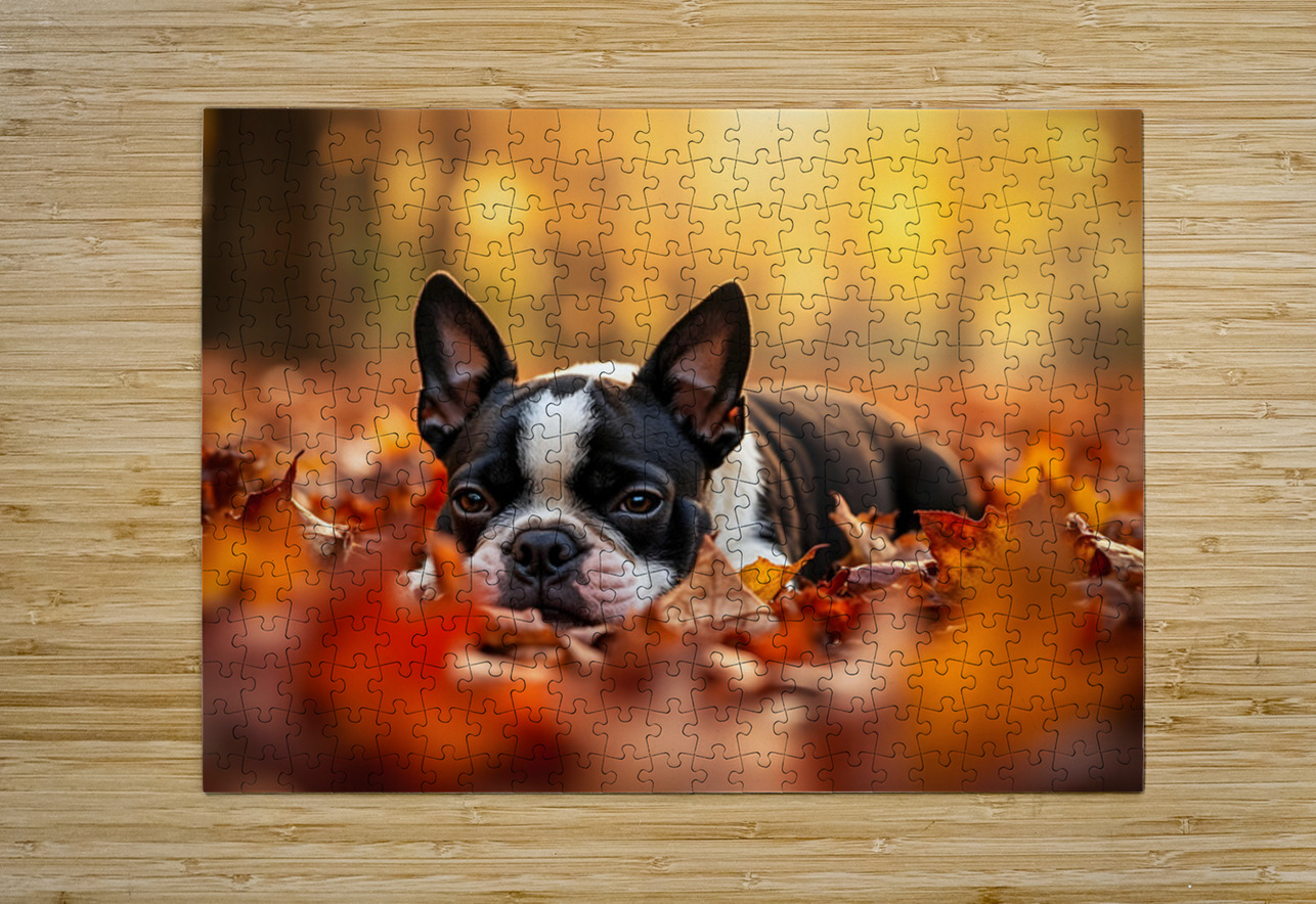 Sleepy Boston Terrier Puppy Rests In Autumn Leaves Puppy Prints Puzzle printing