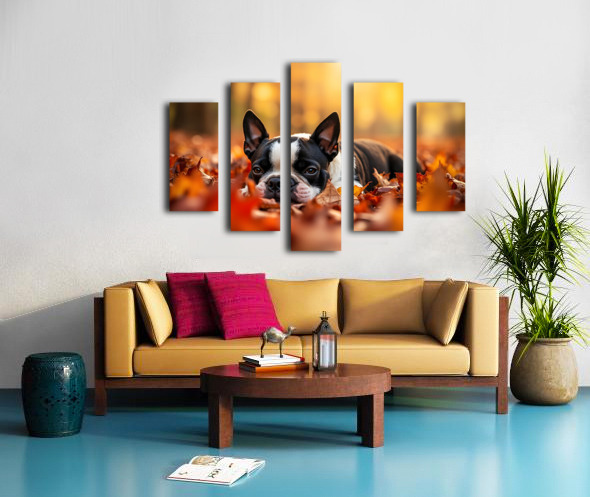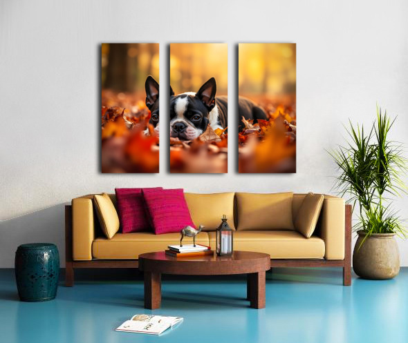 Sleepy Boston Terrier Puppy Rests In Autumn Leaves Canvas print