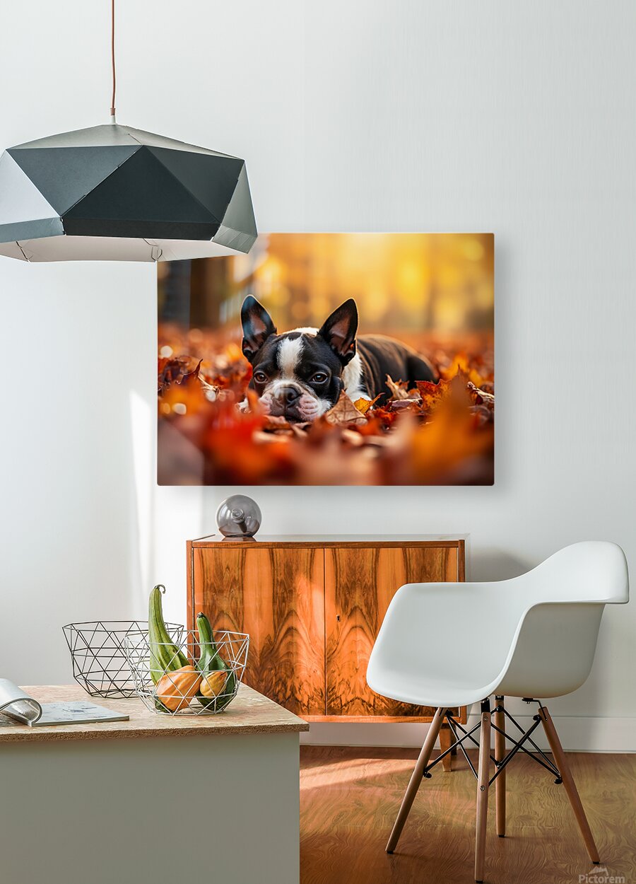 ABOUT THIS ARTWORK: SLEEPY BOSTON TERRIER PUPPY RESTS IN AUTUMN LEAVES