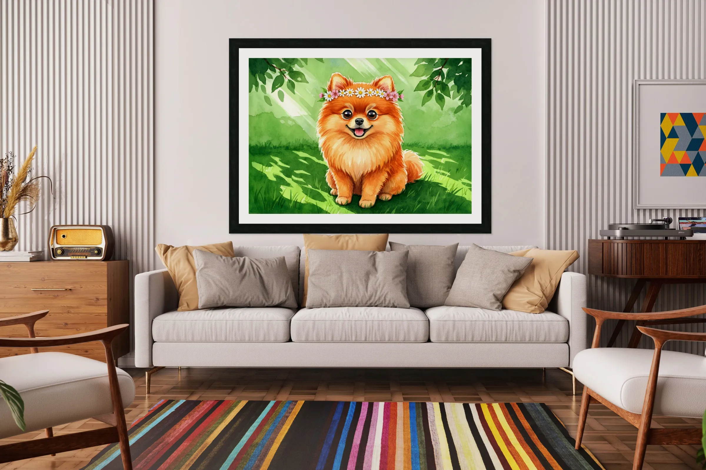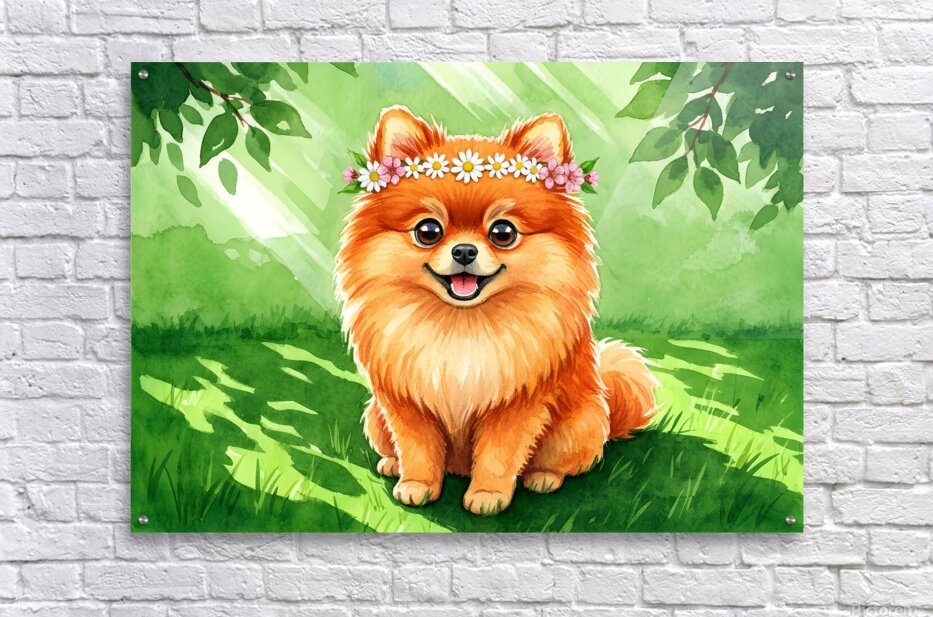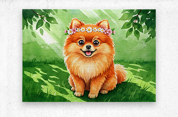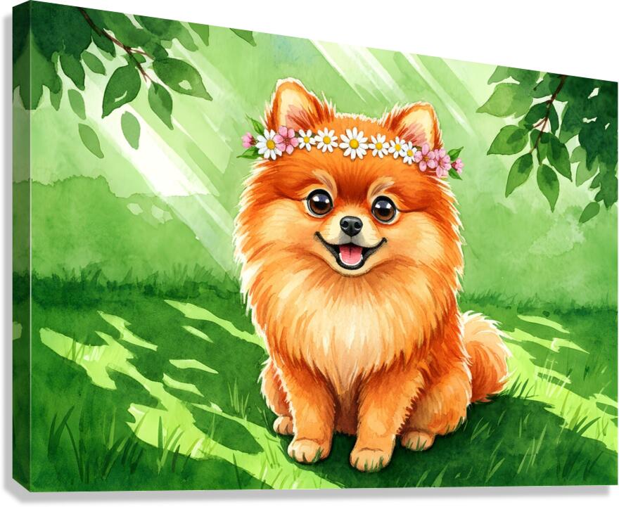 Get this artwork "Pomeranian Puppy Discovers A Beautiful Flower Crown" in a framed print.