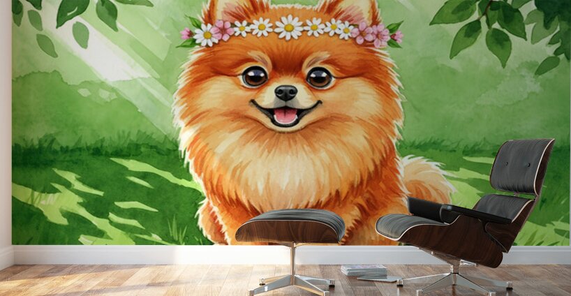 An adorable orange Pomeranian puppy sits in a vibrant garden setting adorned with a charming flower crown of white daisies and pink blossoms. The puppys fluffy coat glows in the warm sunlight as green grass and foliage create a natural backdrop. Digital Artwork.