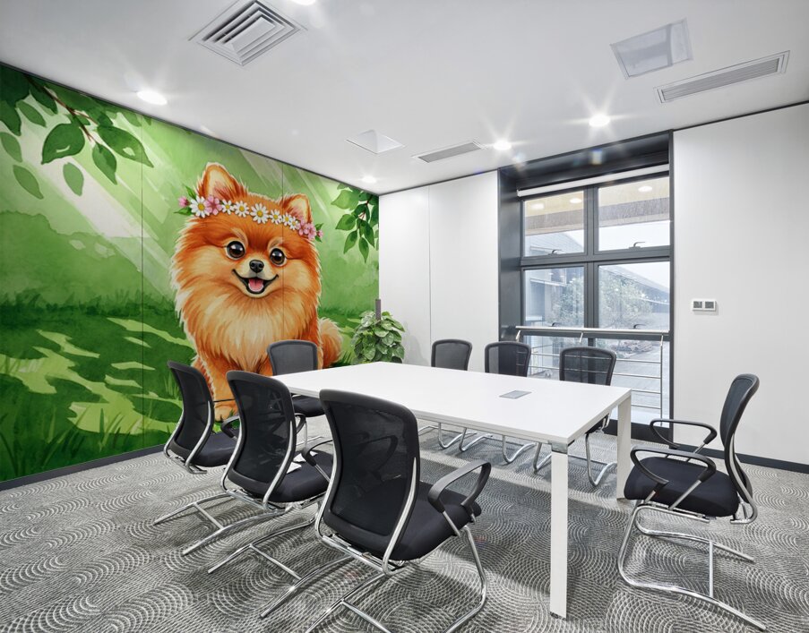 ABOUT THIS ARTWORK: POMERANIAN PUPPY DISCOVERS A BEAUTIFUL FLOWER CROWN