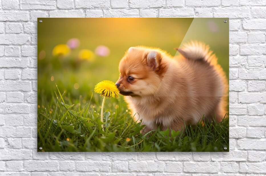 ABOUT THIS ARTWORK: POMERANIAN PUPPY DISCOVERS YELLOW DANDELION IN MEADOW