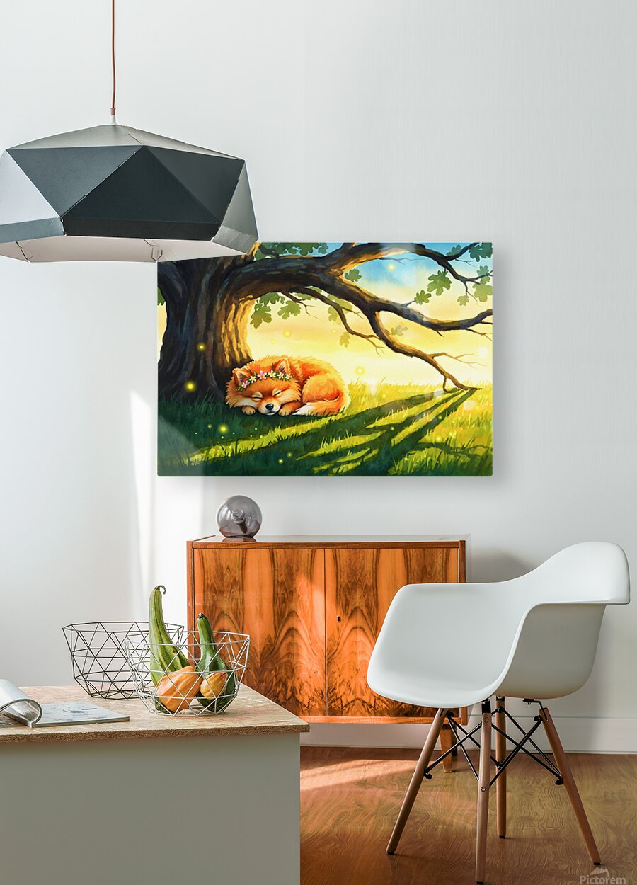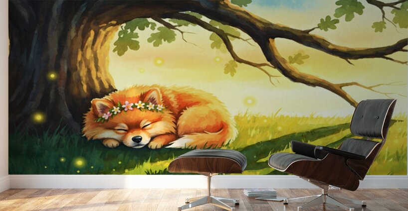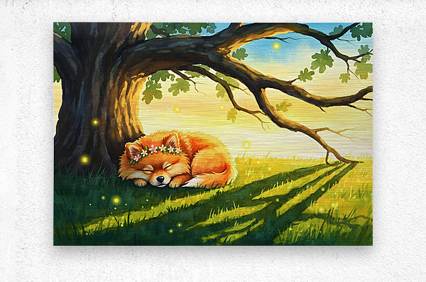 The tired orange Pomeranian puppy sleeps peacefully beneath a mighty oak tree as sunset paints the sky. Its flower crown of daisies and pink blossoms remains adorned while fireflies begin their twilight dance in the warm golden light. Digital Artwork.