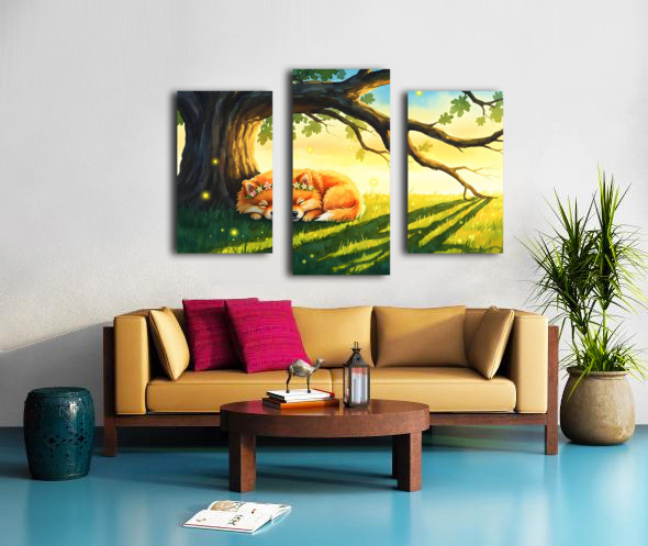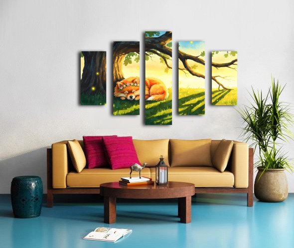 Pomeranian Puppy Sleeps Under Oak Tree At Sunset Canvas print