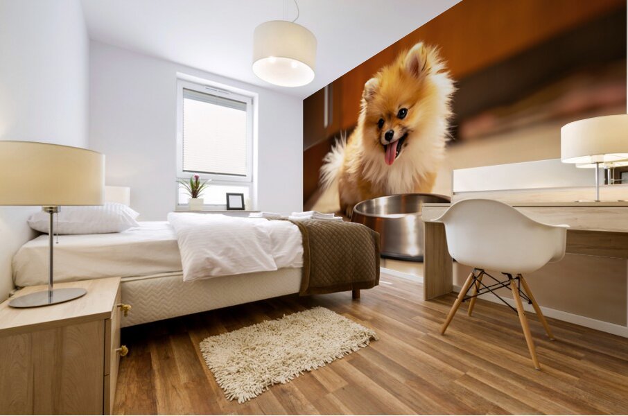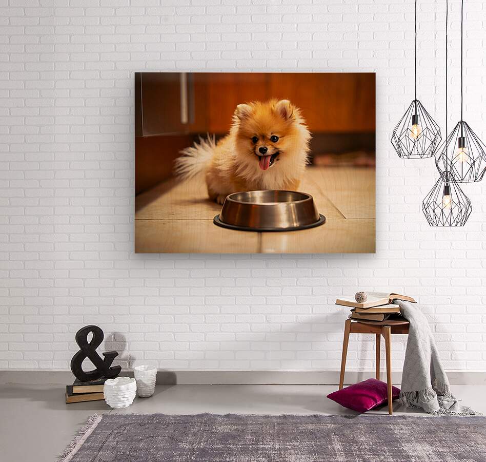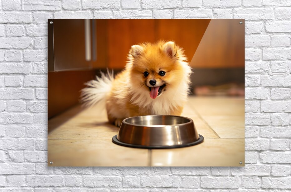 Get this artwork "Pomeranian Puppy Waits By Empty Food Bowl" in a framed print.