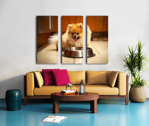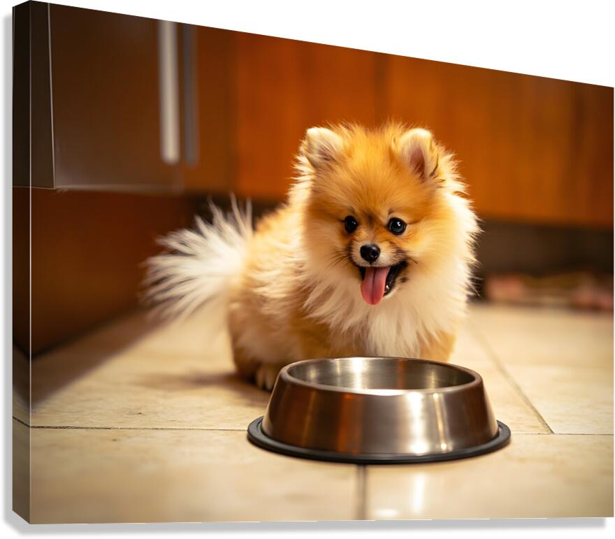 Pomeranian Puppy Waits By Empty Food Bowl Canvas print