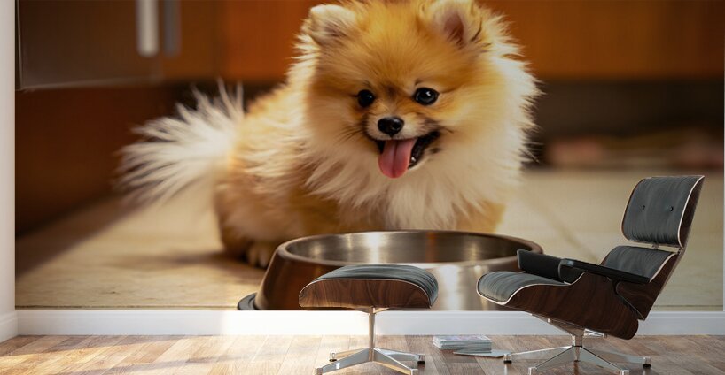 An adorable orange and white Pomeranian puppy sits eagerly beside a shiny silver food bowl on a kitchen floor. The fluffy little dog has perked ears and bright eyes showing anticipation as it waits by the empty bowl. Digital Artwork.