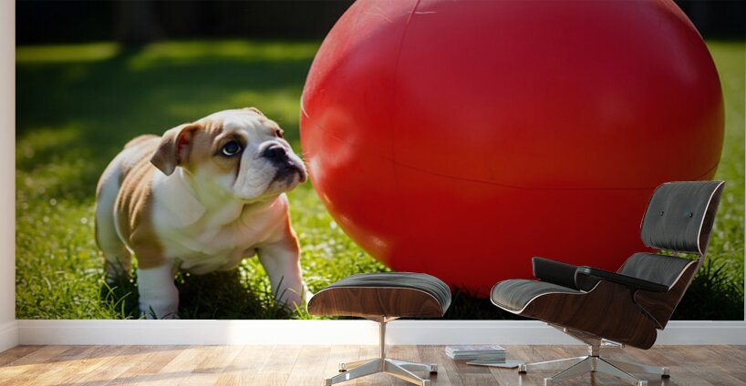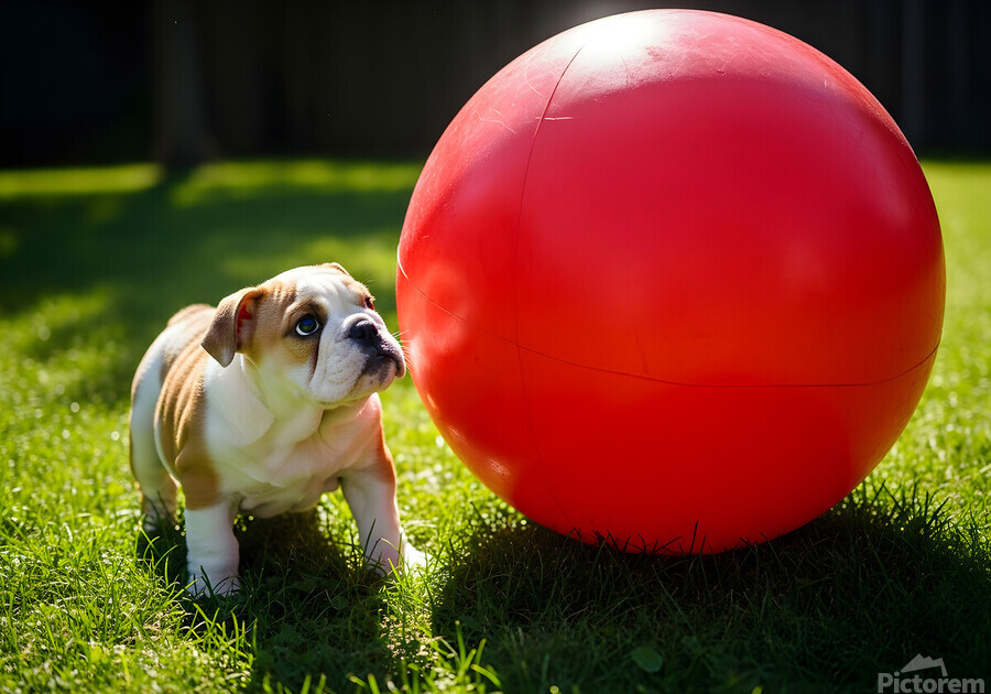 A tiny cream and white bulldog puppy stands next to an enormous bright red rubber ball in a grassy backyard. The puppy looks up at the towering ball with wide curious eyes and an excited expression. Digital Artwork.