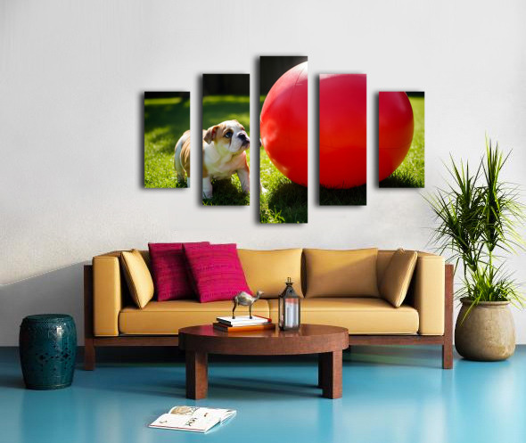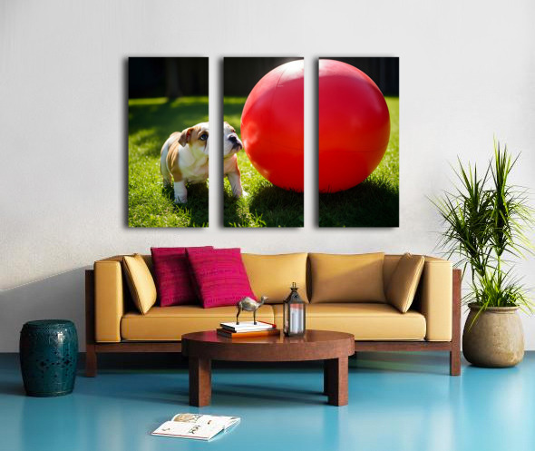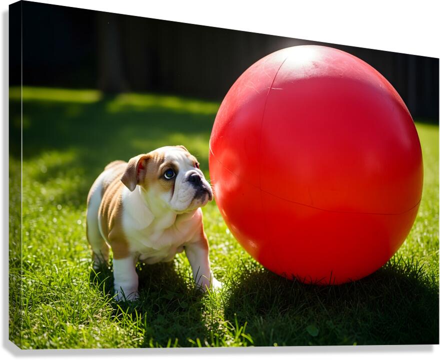 Bulldog Puppy Discovers Giant Red Ball Canvas print