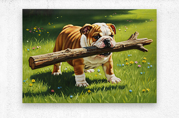 Get this artwork "Bulldog Puppy Finds Big Wooden Stick" in a framed print.