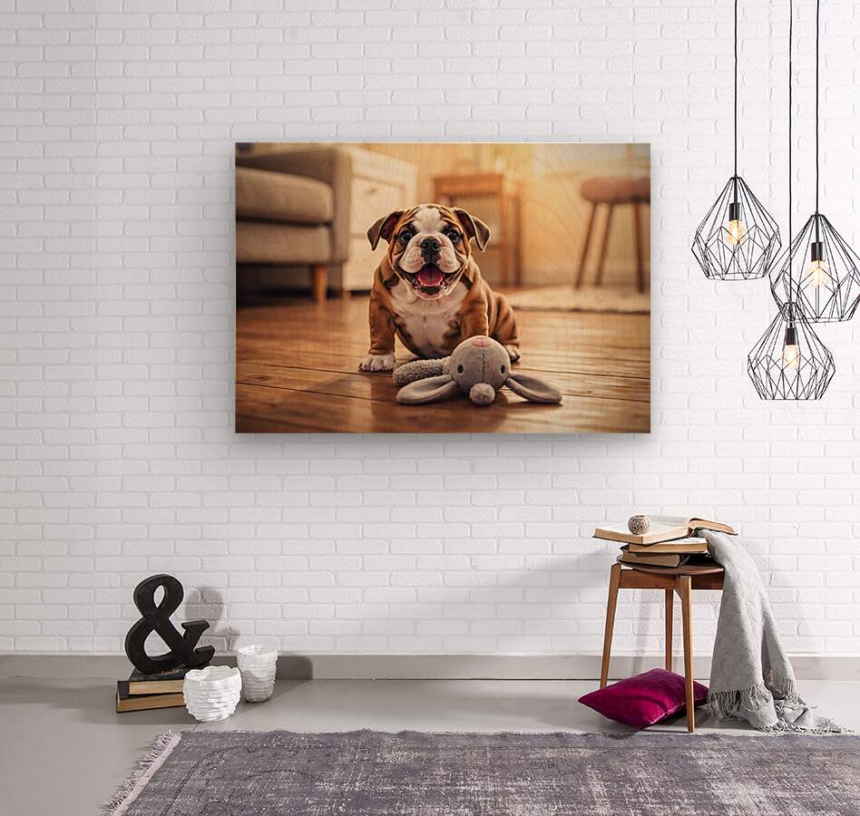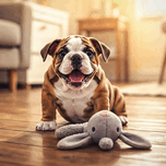 A cute brown and white bulldog puppy with characteristic wrinkles sits on wooden flooring eyes bright with excitement as he spots a soft gray plush rabbit toy nearby. The puppys mouth is open in anticipation. Digital Artwork.