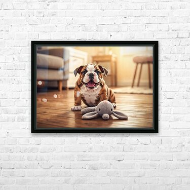 Bulldog Puppy Discovers New Plush Rabbit Friend Frame print