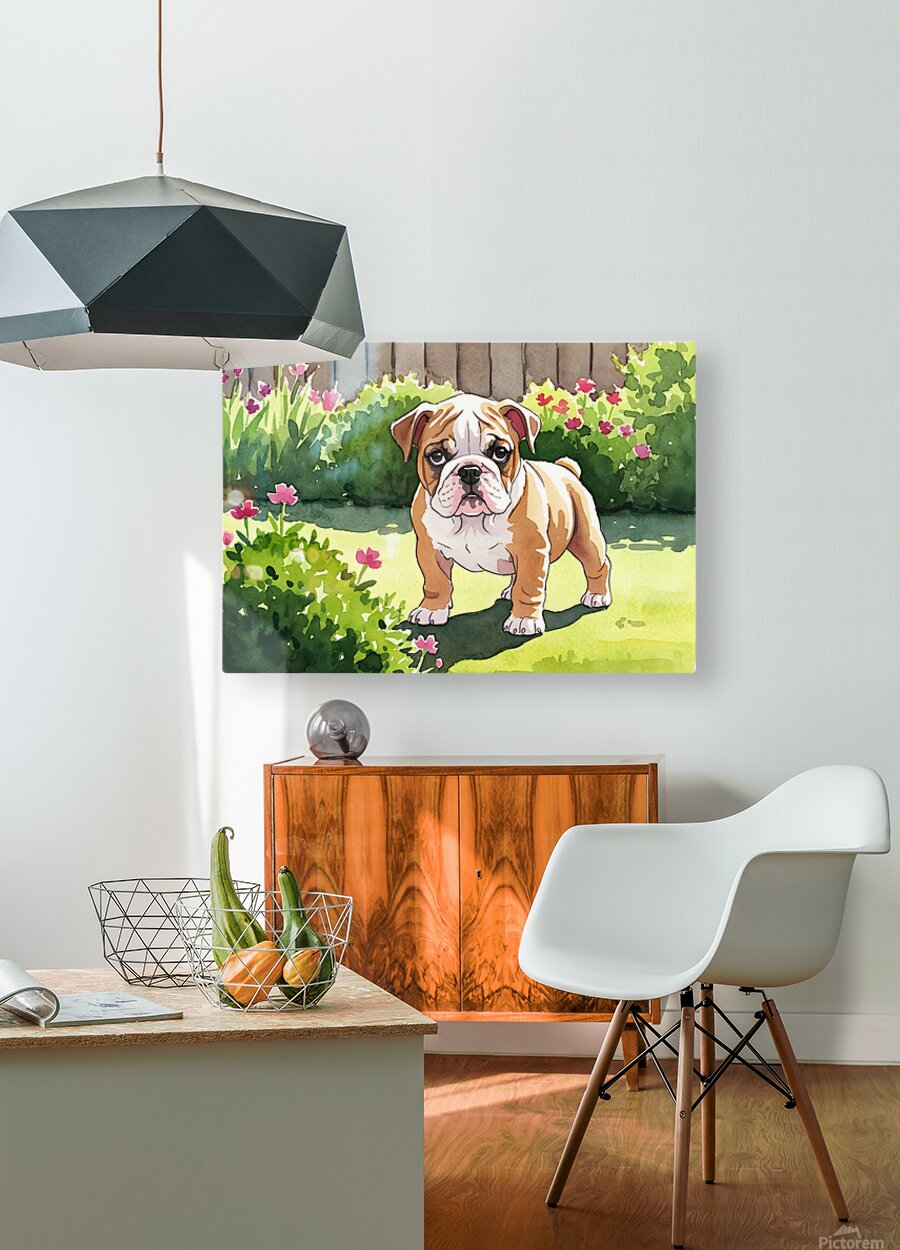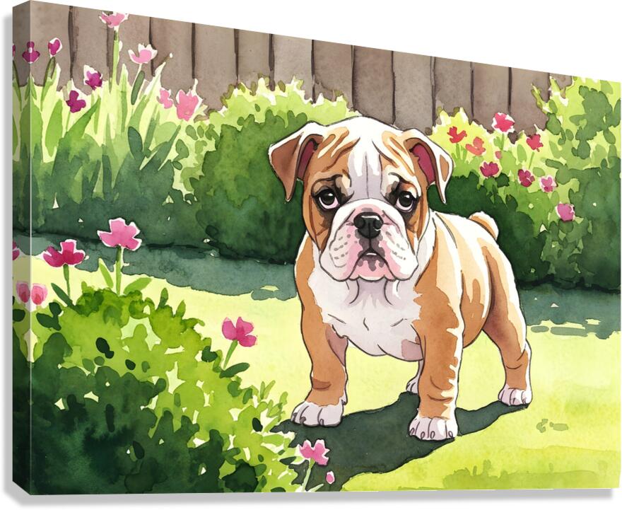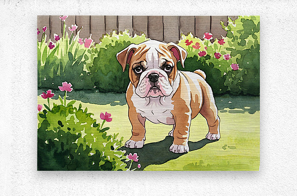 Get this artwork "Bulldog Puppy Explores The Garden Alone" in a framed print.