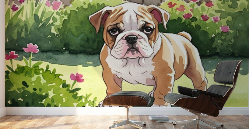 A young tan and white bulldog puppy with characteristic wrinkled features stands in a bright garden setting appearing curious but cautious as it explores the outdoor space surrounded by soft-focus blooming plants. Digital Artwork.