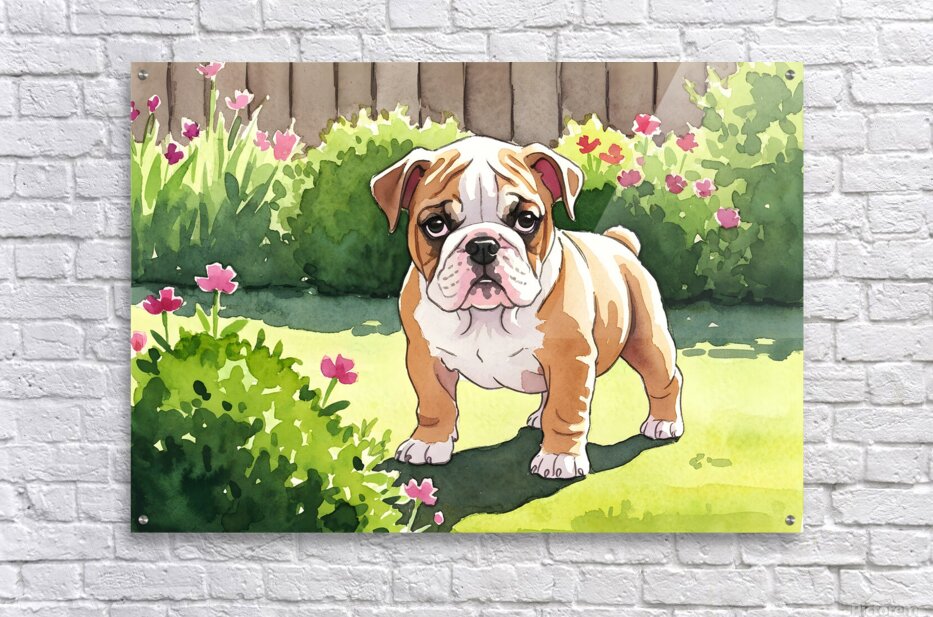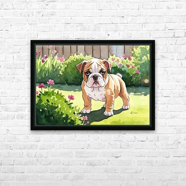 Get this artwork "Bulldog Puppy Explores The Garden Alone" in a framed print.