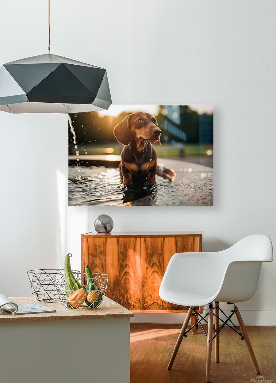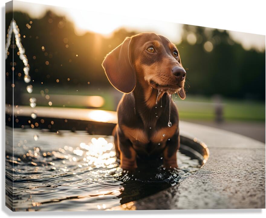 The satisfied brown and tan dachshund puppy sits peacefully next to the fountain with wet whiskers and a content smile after successfully getting a drink Digital Artwork.