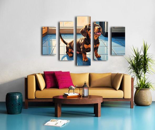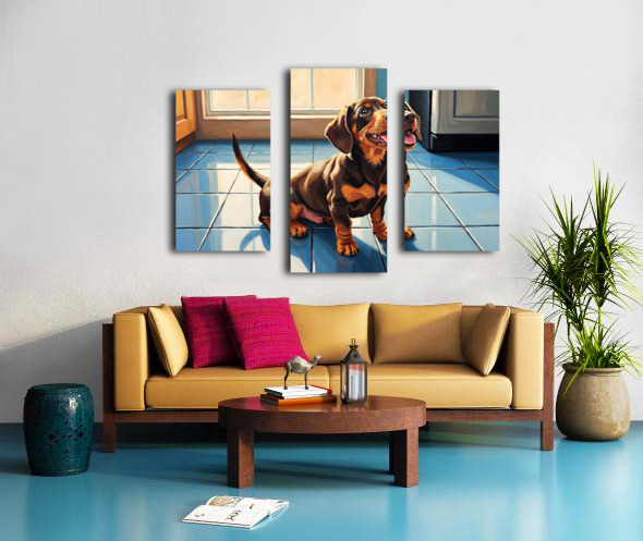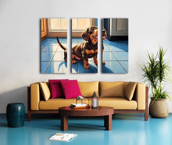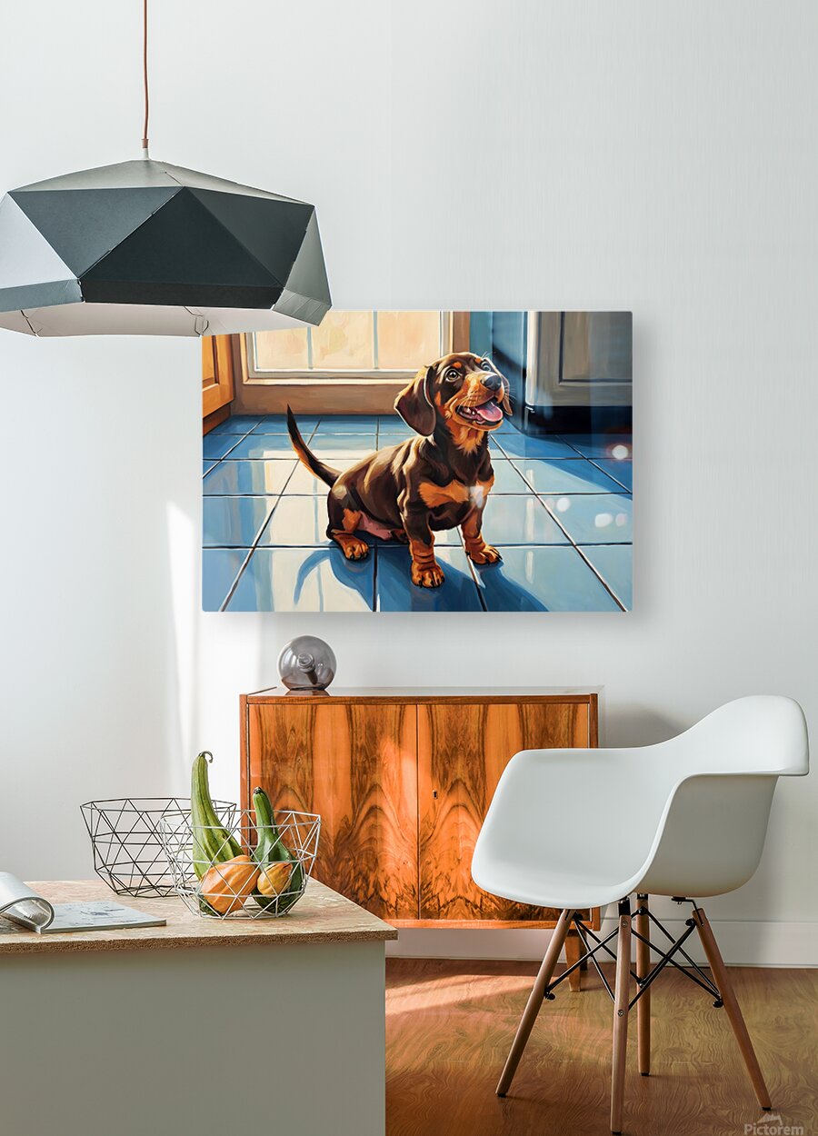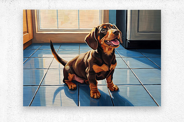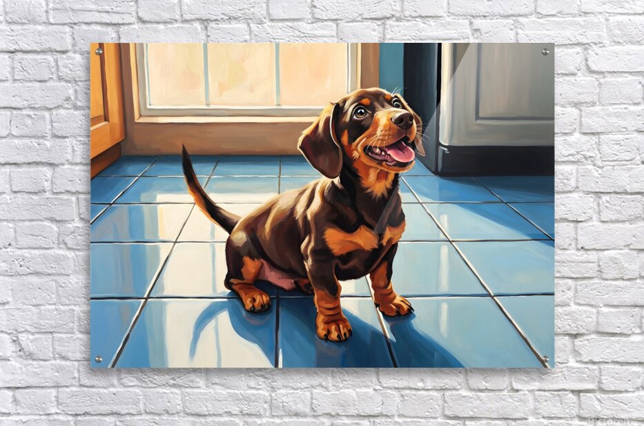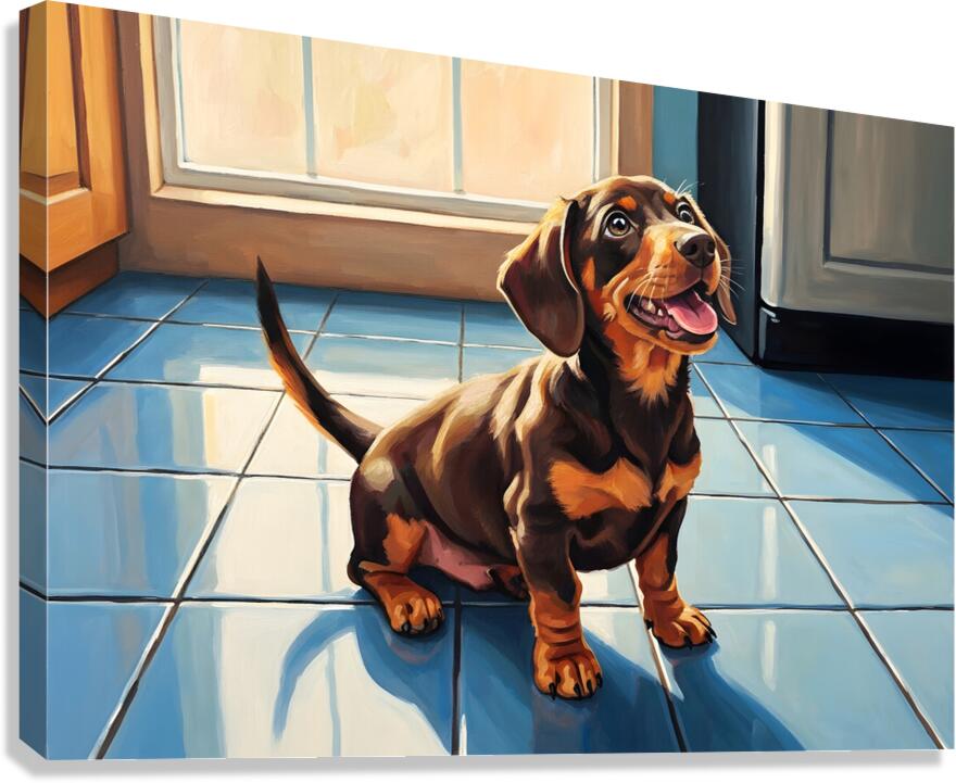 A cute brown and tan dachshund puppy sits on white kitchen tiles gazing upward with hopeful eyes. The puppys pink tongue peeks out slightly as it anticipates something delicious with natural light streaming through nearby windows. Digital Artwork.