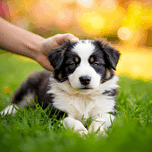A drowsy black and white Border Collie puppy rests peacefully on grass looking completely satisfied and relaxed after receiving wonderful ear scratche...[+]