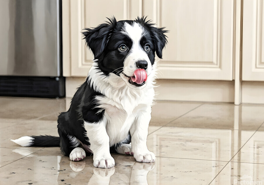 A fluffy black and white Border Collie puppy sits on a tiled kitchen floor its pink tongue darting out to lick its lips in anticipation. The young dogs bright eyes are focused upward with hopeful excitement. Digital Artwork.