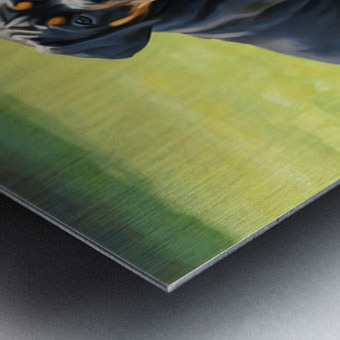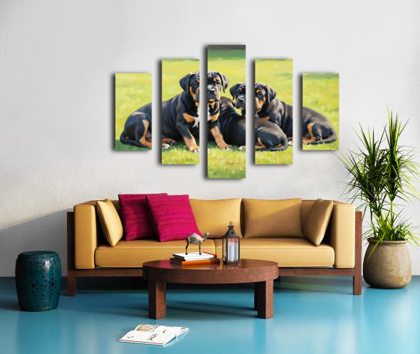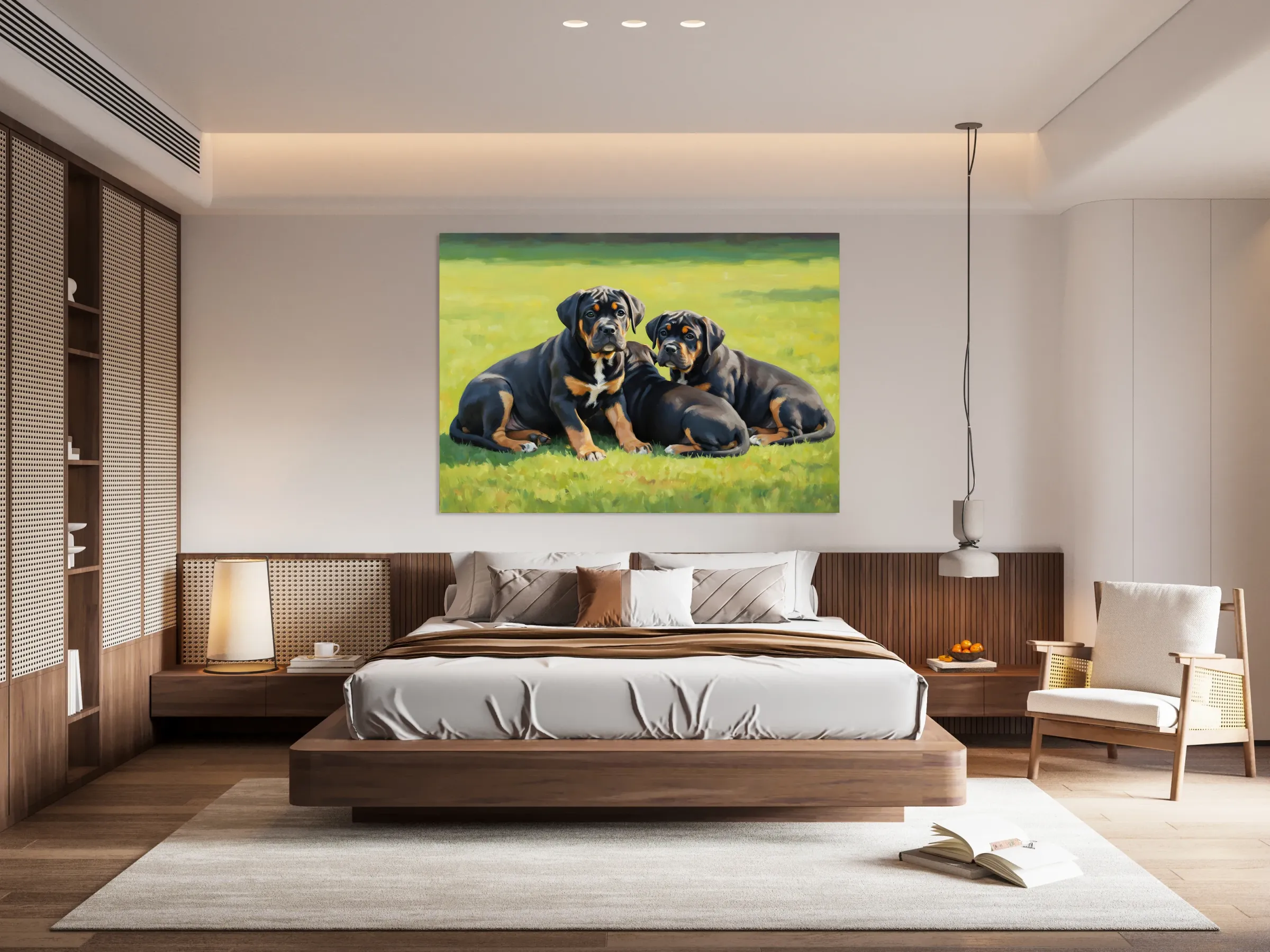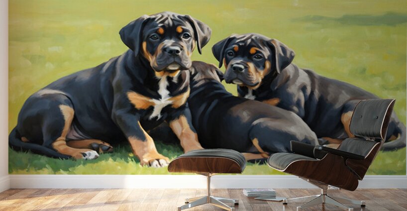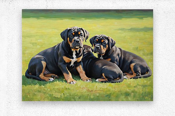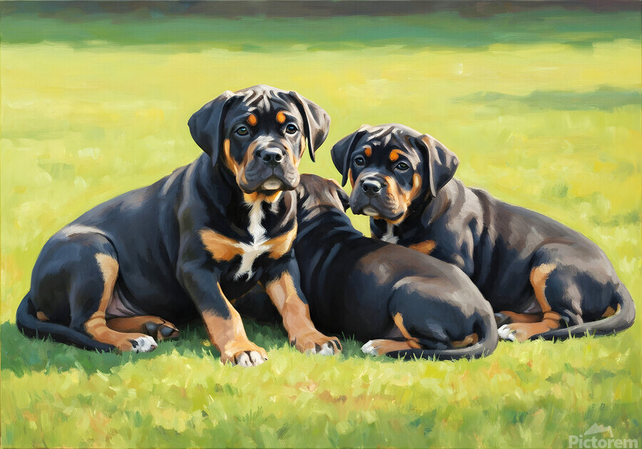 A satisfied black and tan Cane Corso puppy sits peacefully on green grass with other puppies in a relaxed circle. All the puppies look content and tired after their exciting exploration of the fence boundary. Digital Artwork.