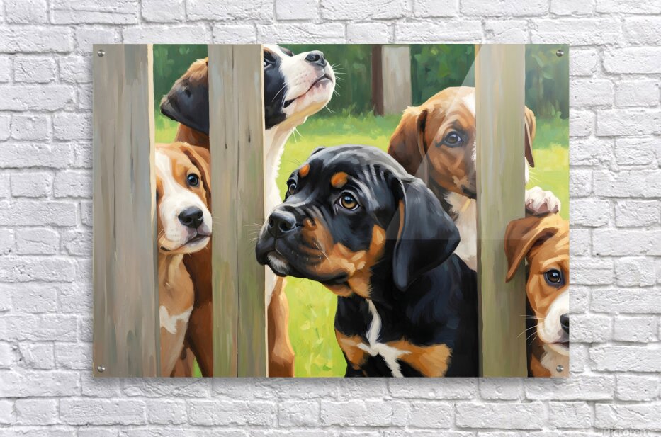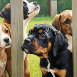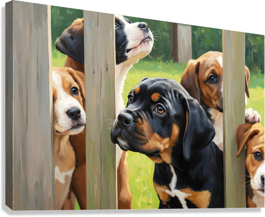 A young black and tan Cane Corso puppy with soft floppy ears and bright curious eyes presses against a wooden fence. Other puppies of various breeds gather behind all looking through the fence slats with wonder and excitement. Digital Artwork.