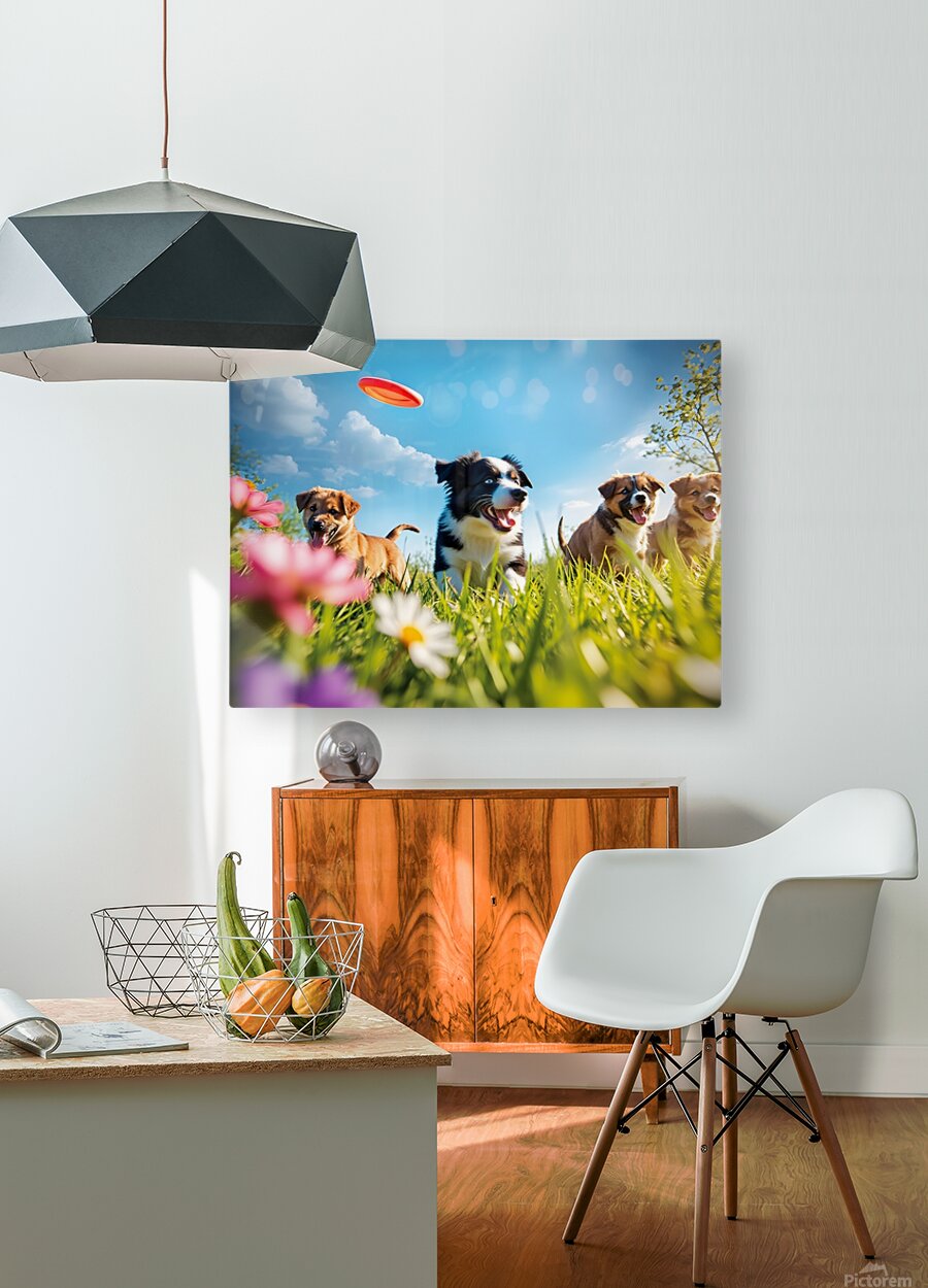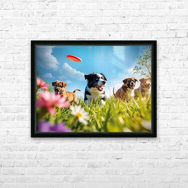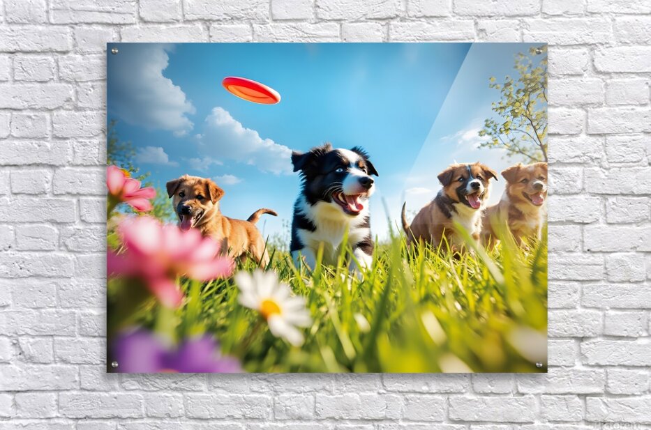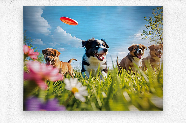 A black and white Border Collie puppy playing frisbee with his friends - Digital Artwork