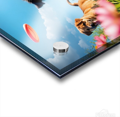 A black and white Border Collie puppy playing frisbee with his f Picture Frame Printing