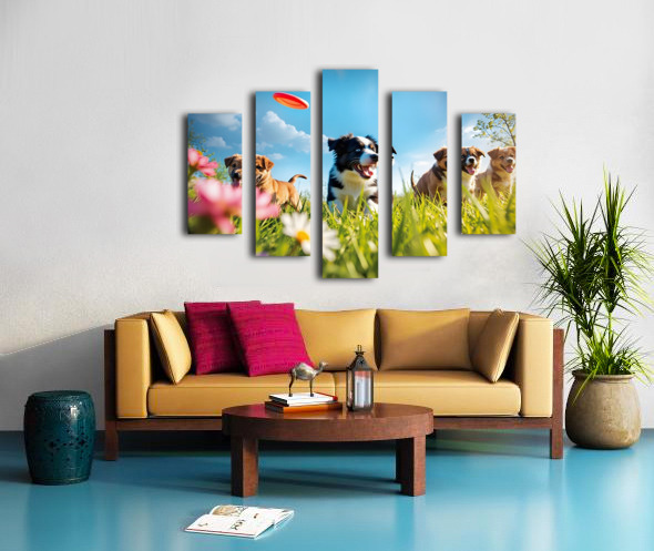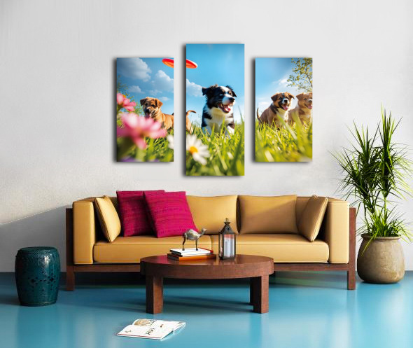 A black and white Border Collie puppy playing frisbee with his f Canvas print