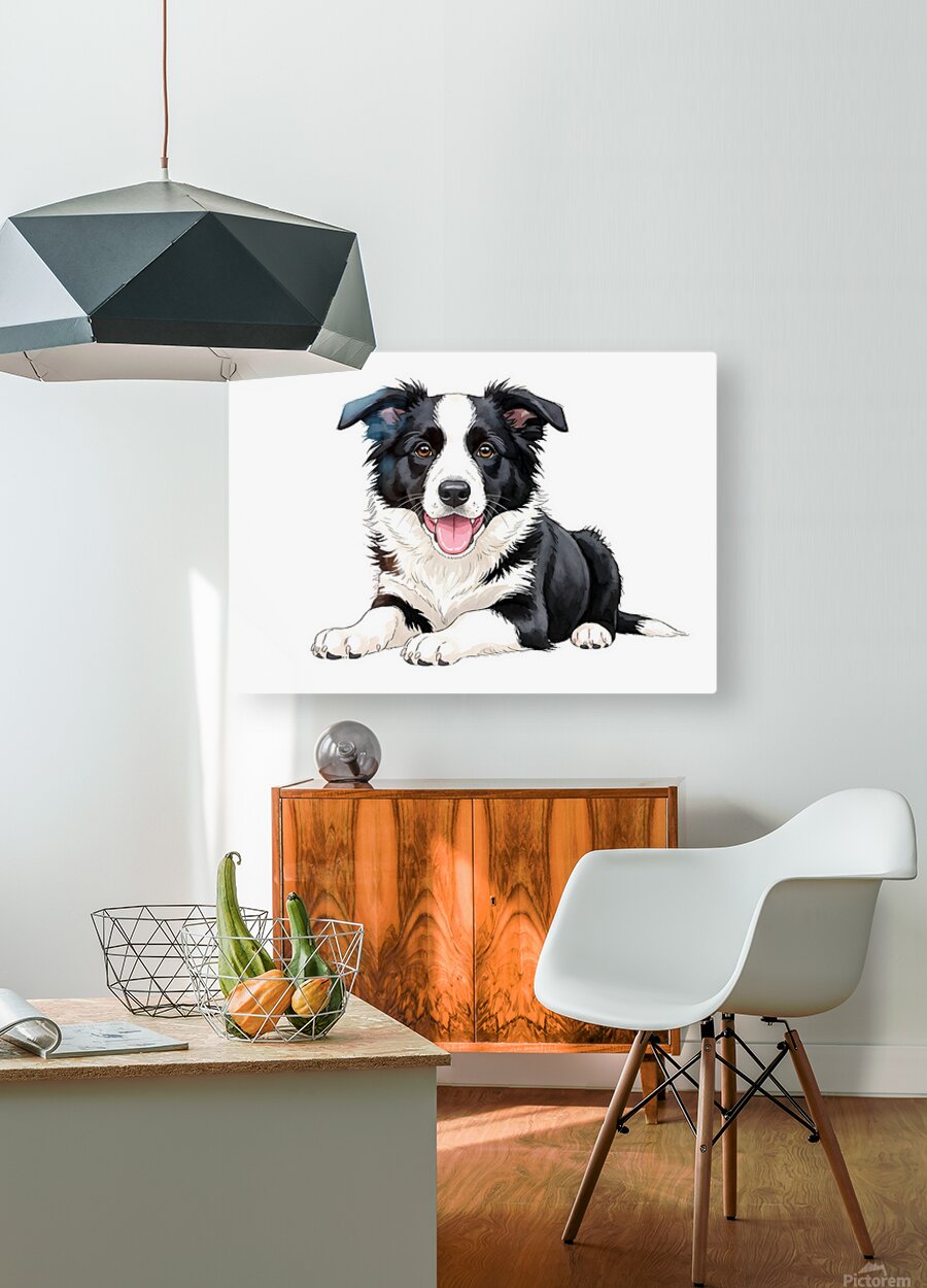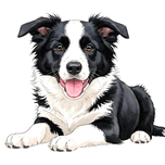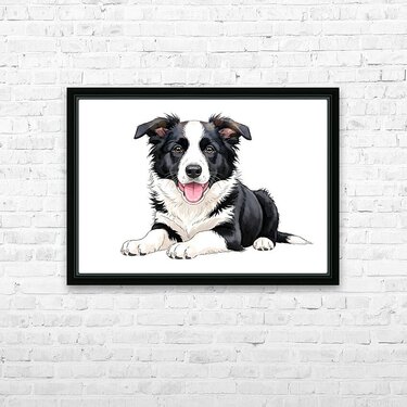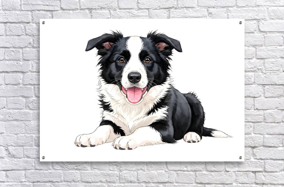 The black and white Border Collie puppy shows pure happiness with a satisfied expression and relaxed posture. Its pink tongue hangs contentedly to one side while bright eyes reflect the joy of receiving a reward. Digital Artwork.